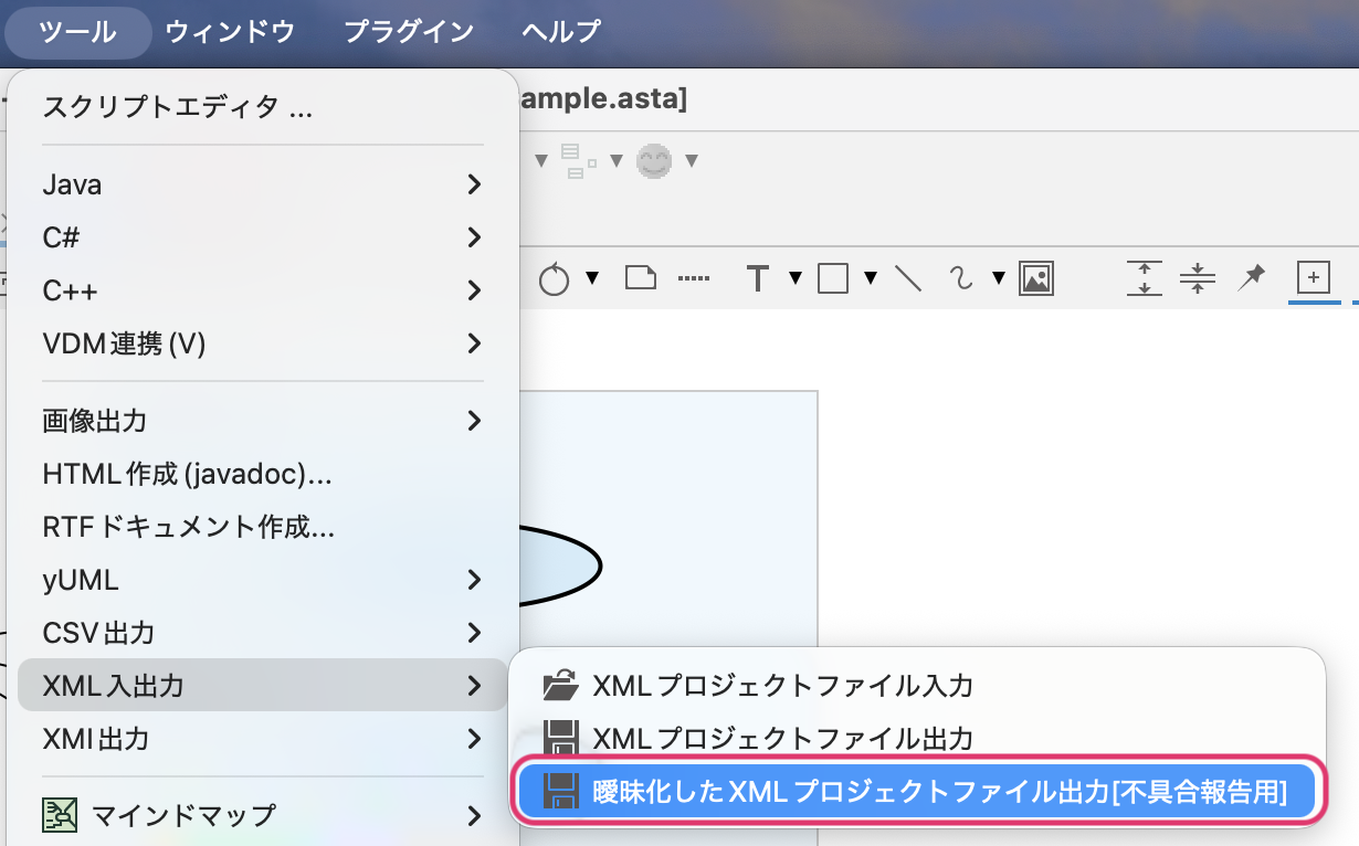 - メインメニューから、[ツール] - [XML入出力] - [曖昧化XMLプロジェクトファイル出力(不具合報告用)]を選択します。