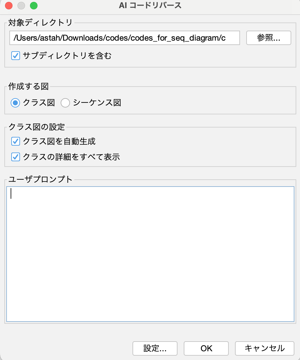 - [クラス図の設定] 、[ユーザープロンプト] をそれぞれ設定します。
